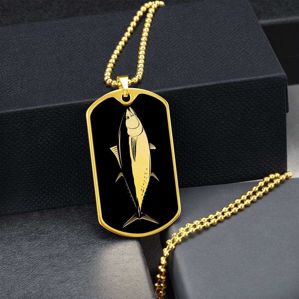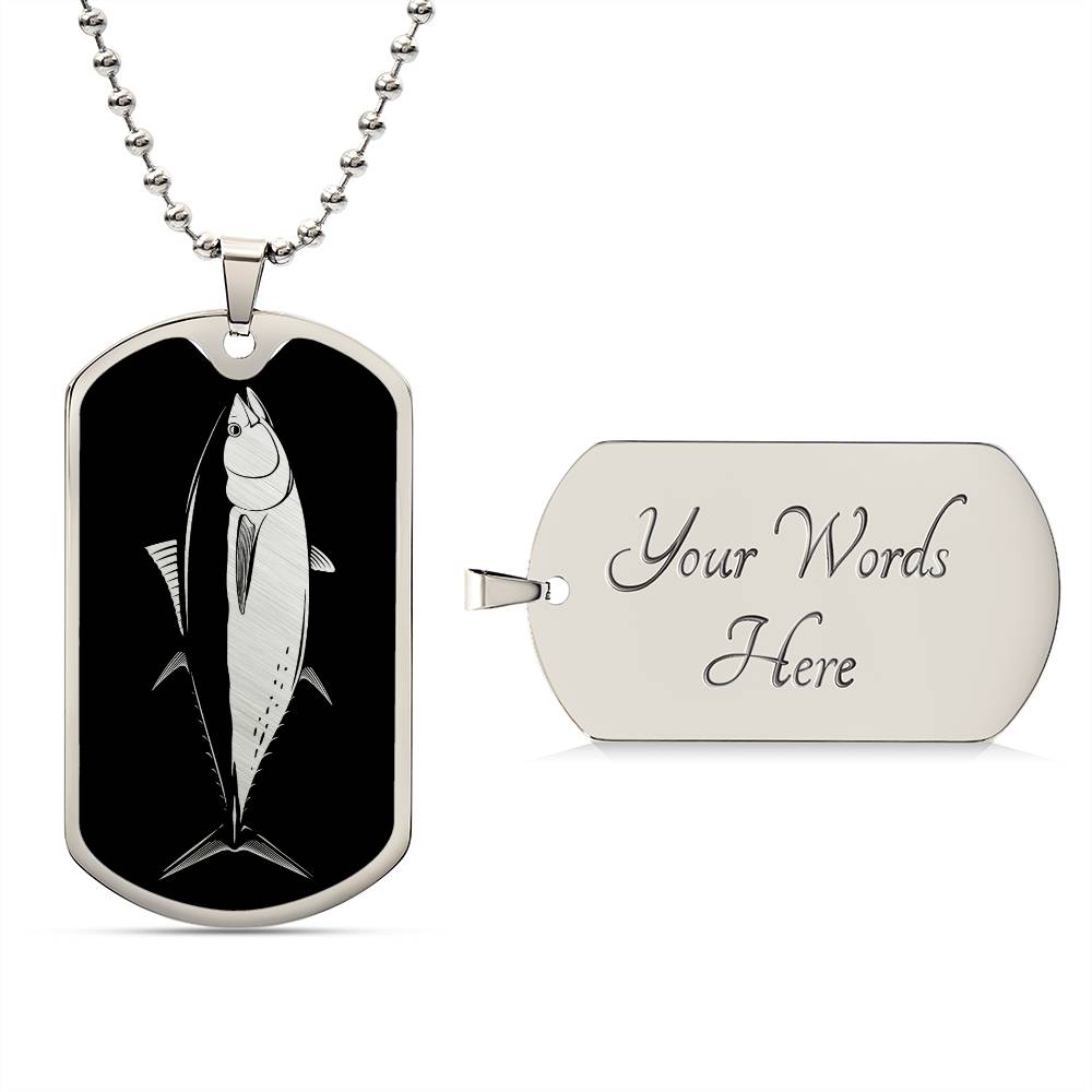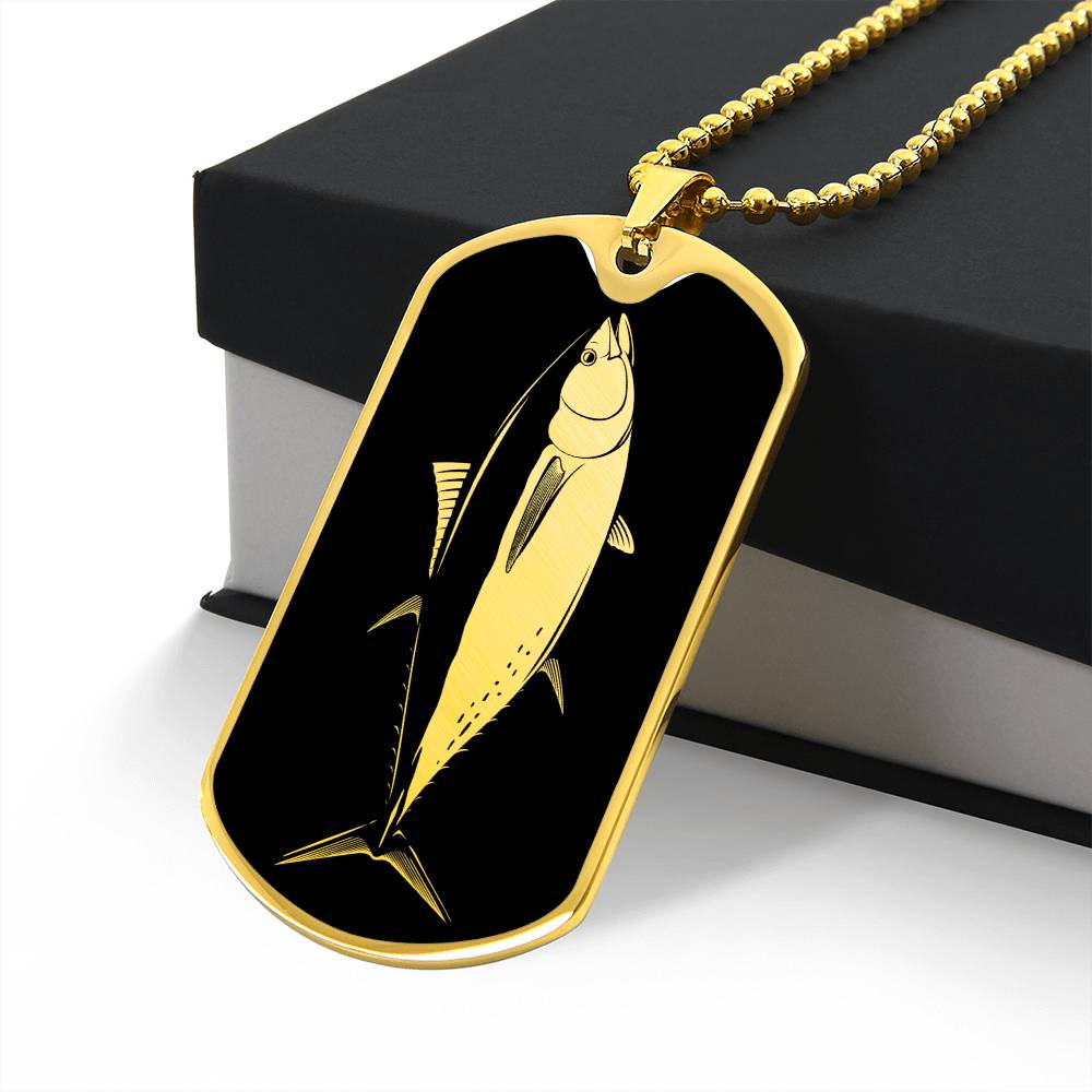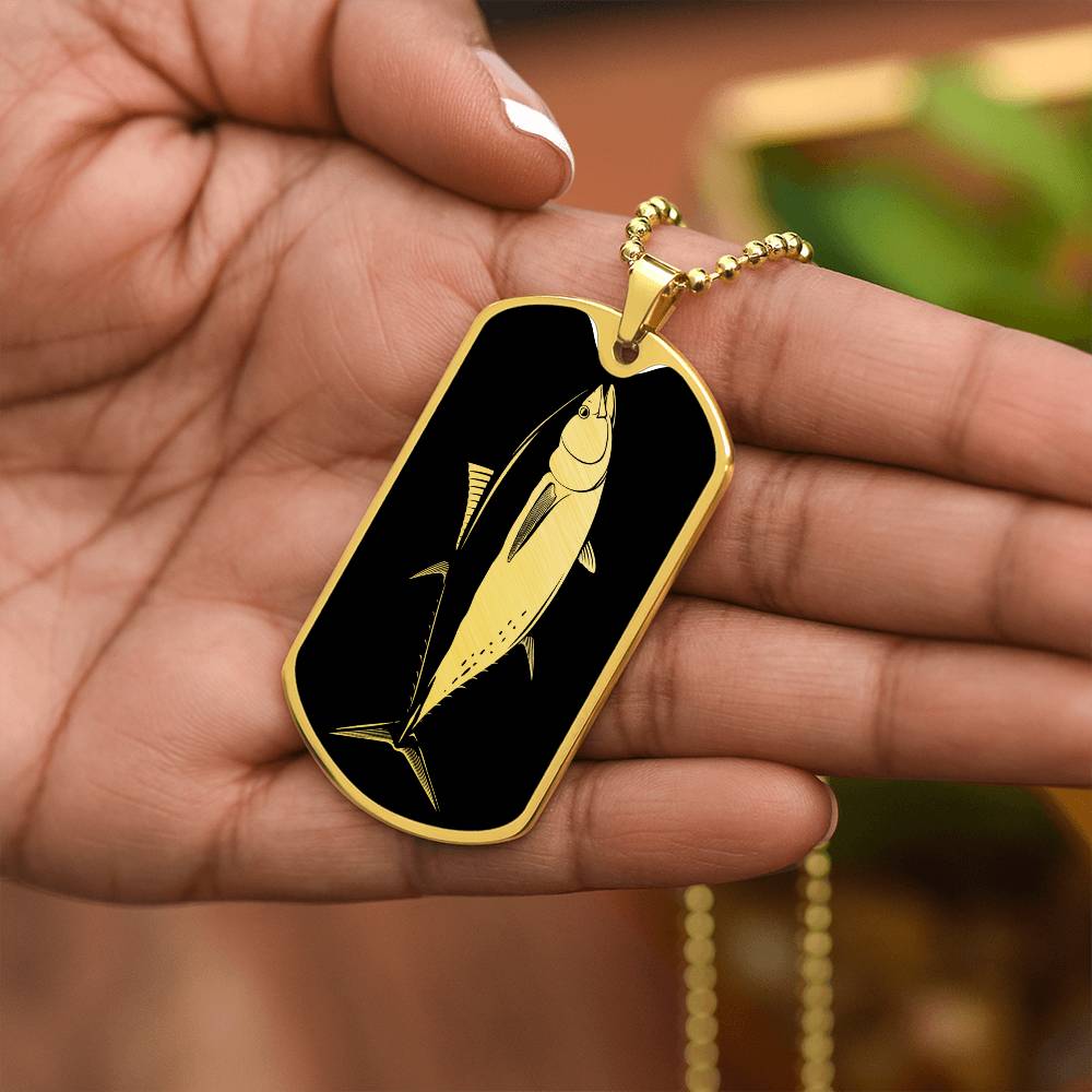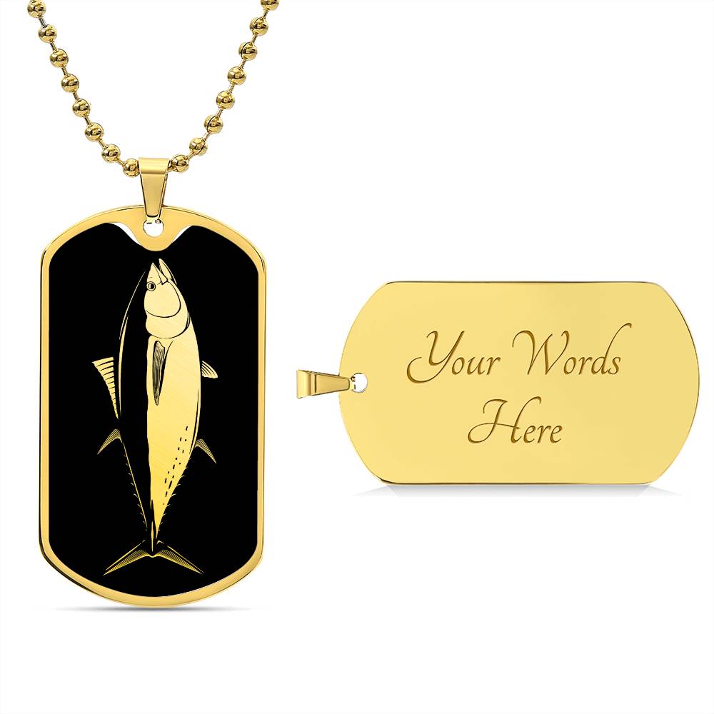 Add a touch of sophistication and individuality to your style with our Personalized Stainless Steel and 18k Yellow Gold Finish Dog Tag Bluefin Tuna Necklace for Men. This stunning necklace combines sleek stainless steel with a luxurious 18k yellow gold finish to create a modern and eye-catching accessory that will make heads turn.